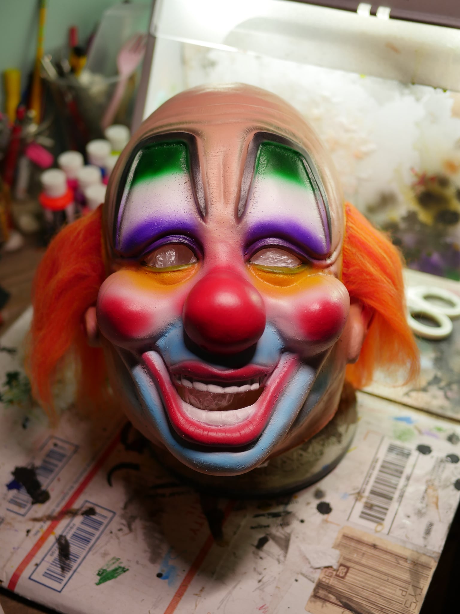 This Rudel Tribute Clown mask is your chance to own a larger wearable copy of the iconic German Clown Mask popularity Shawn Crahan of Slipknot. This mask measures 27 inches and is painted and sealed with plastidip. Comes in clean or grimey. Masks are hand made to order and take 2 to 4 weeks to ship